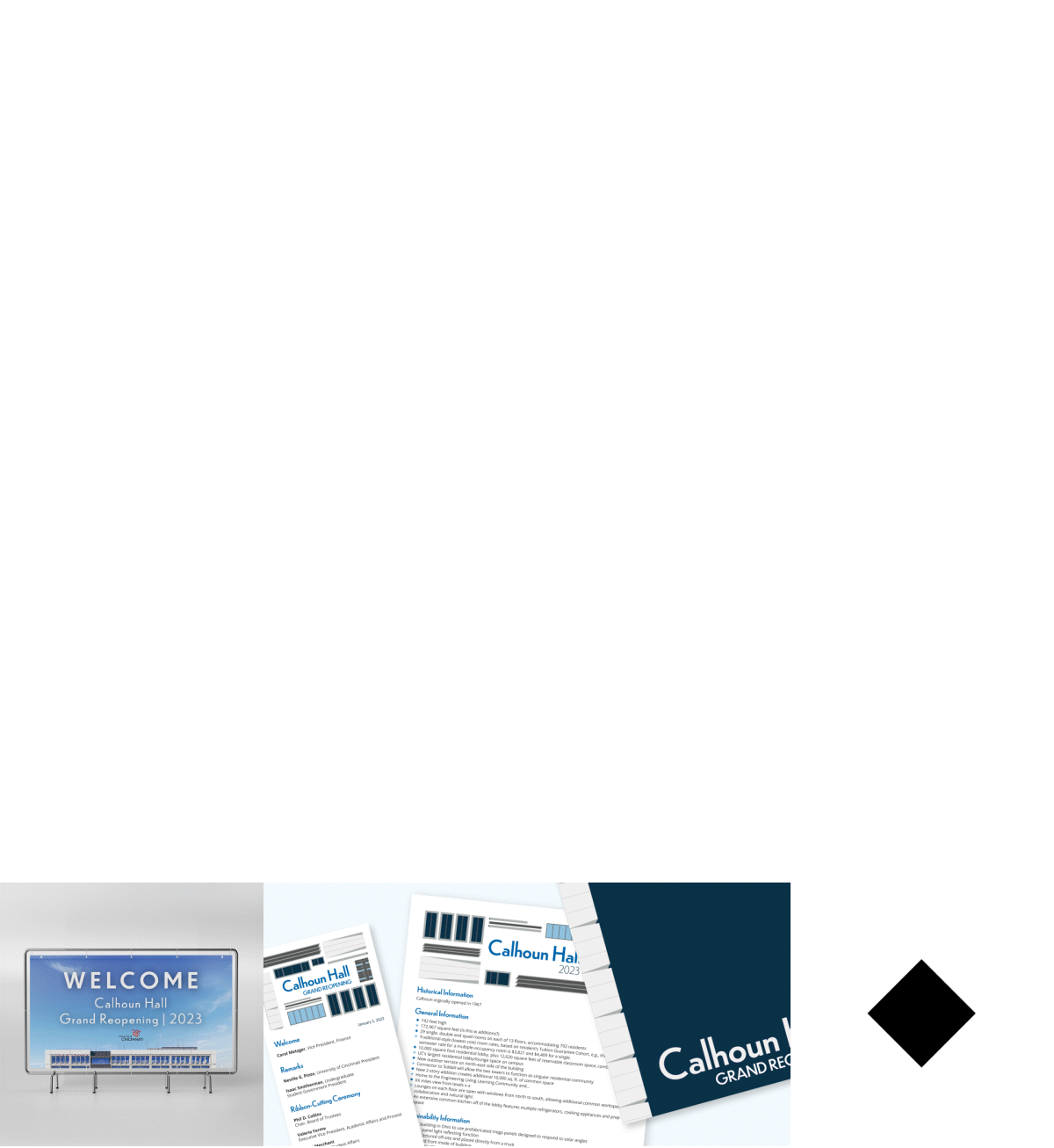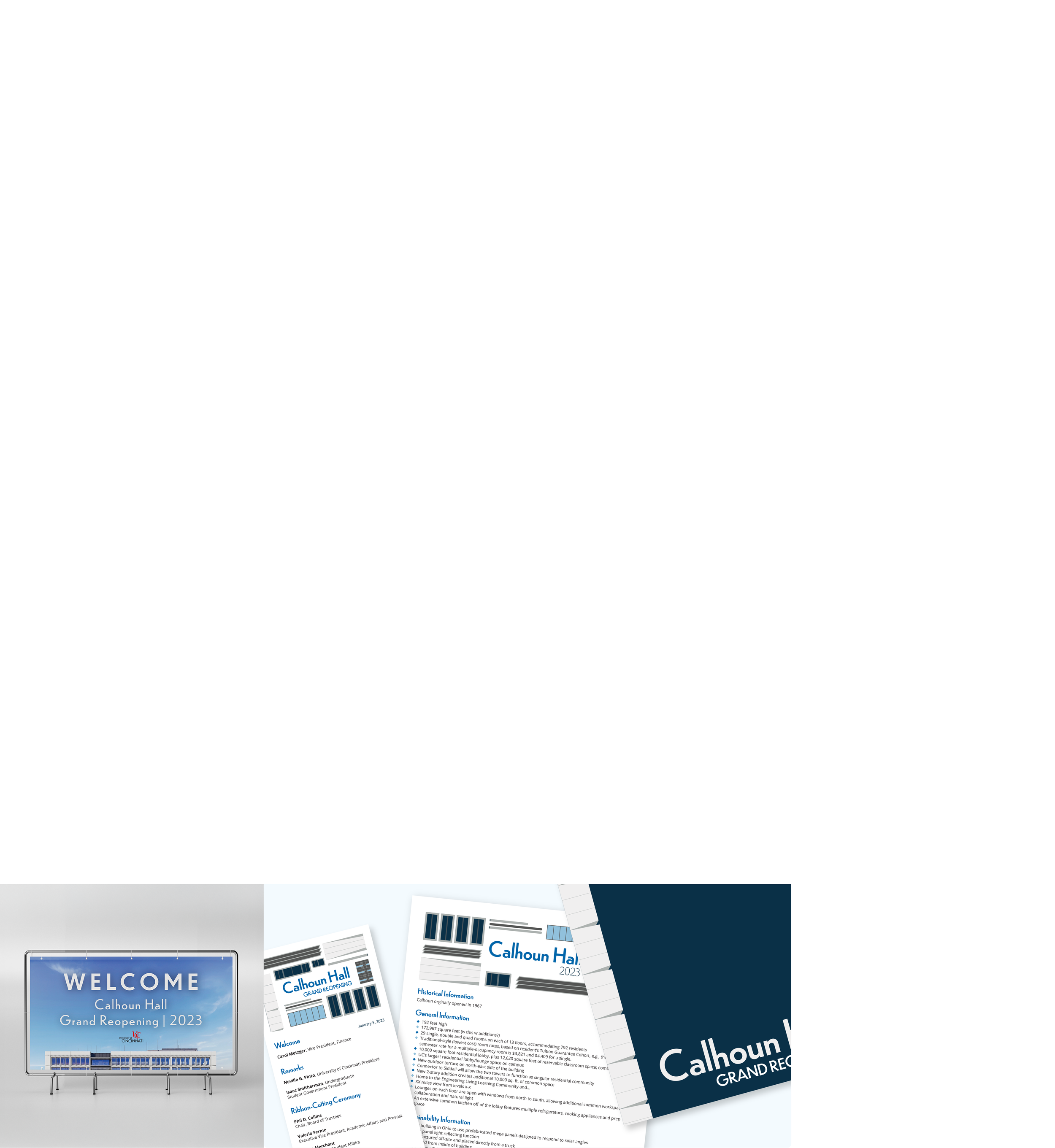 The Calhoun Hall re-opening project was part of a co-op with Univeristy of Cincinnati Campus Services Marketing. This department consists of all the non-academic business units that create a campus environment where all can study, live, work, meet, eat, park, shop, get fit, and stay. The marketing department supports and serves all those units & produces campus events. I collaborated with another co-op to create the designs seen here.